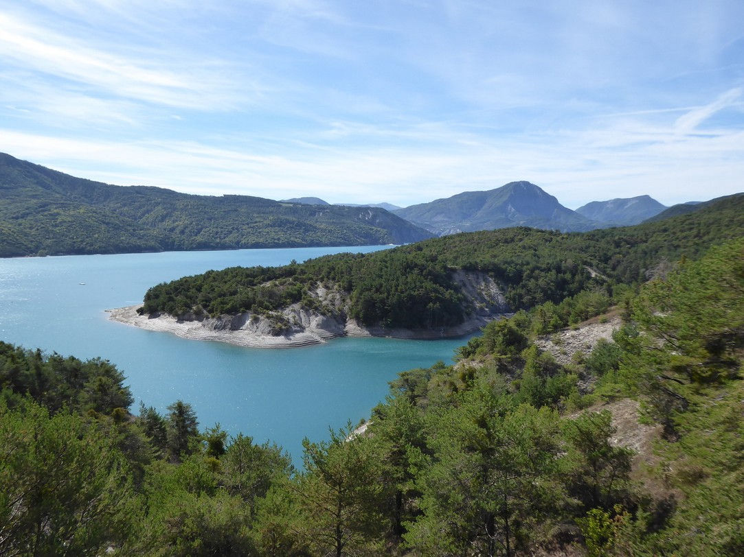 Le VVF domine une crique du lac de Serre-Ponçon, le grand héros de la région. C’est en le parcourant en bateau et en visitant le muséoscope que nous avons appris la nécessité de ce barrage (réguler la Durance dont les crues étaient dévastatrices et former un immense réservoir d’eau pour l’agriculture) et sa particularité (barrage en terre acceptant plus facilement les déformations en cas de tremblement de terre).