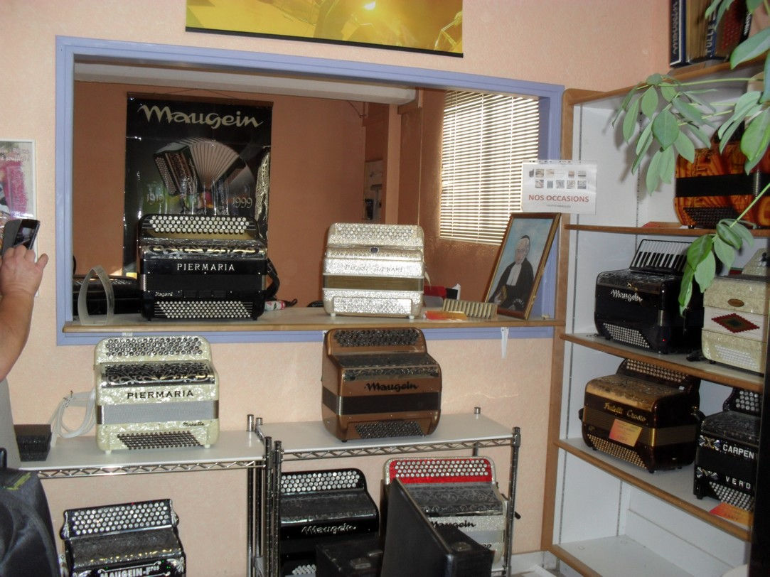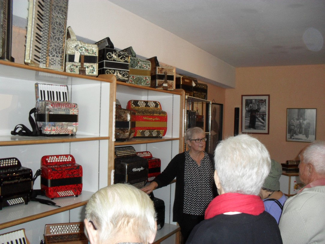 Nous partons en car de bon matin par la N 89 puis la A 89 en direction de la Corrèze ; un peu de brouillard en arrivant à Tulle, mais ensuite nous aurons très chaud jusqu’au soir ! A Tulle, la Manufacture d’Accordéons Maugein nous accueille, d’abord dans la salle d’exposition d’instruments magnifiques où notre guide nous explique la complexité du piano à bretelles dont nous verrons ensuite chaque étape de fabrication dans les ateliers, du sommier en bois au moment délicat de l’accord de chaque note : que de pièces compliquées et fragiles assemblées à la main, quelle minutie !