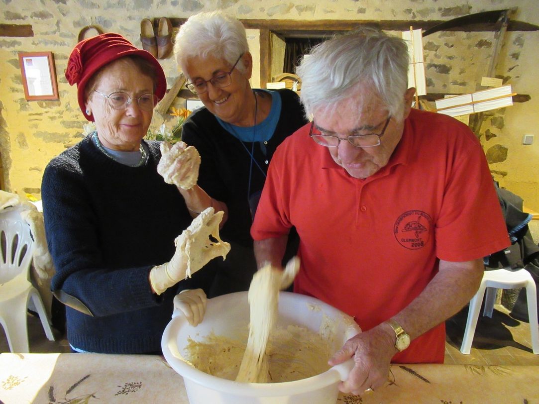 Vendredi 26 octobre : Départ matinal vers les Combrailles pour faire son pain au Moulin…Le lieu est un peu secret, mais on y est accueilli chaleureusement par le guide des lieux, Claude, qui nous montre le four, le bief qui alimente la roue, puis la salle où nous faisons nous-mêmes notre pain en suivant ses conseils éclairés pour doser, pétrir, façonner les pains… Pendant que la pâte lève, excellent repas chez Nicole, à Charbonnières les Vieilles, et au retour, les pains sont mis au four à bois préparé en notre absence. Le temps de cuisson nous permet de visiter le moulin pour comprendre in situ toutes les étapes de la mouture du blé et les autres fonctions d’un moulin au XIXème siècle. Le pain est cuit, il refroidit tranquillement pendant que Claude fait fonctionner ses maquettes de moulins à vent, et résout les énigmes posées le matin ! Quel plaisir d’emporter en fin d’après-midi son pain odorant avant de faire un petit tour vers le Gour de Tazenat pour compléter cette belle journée !