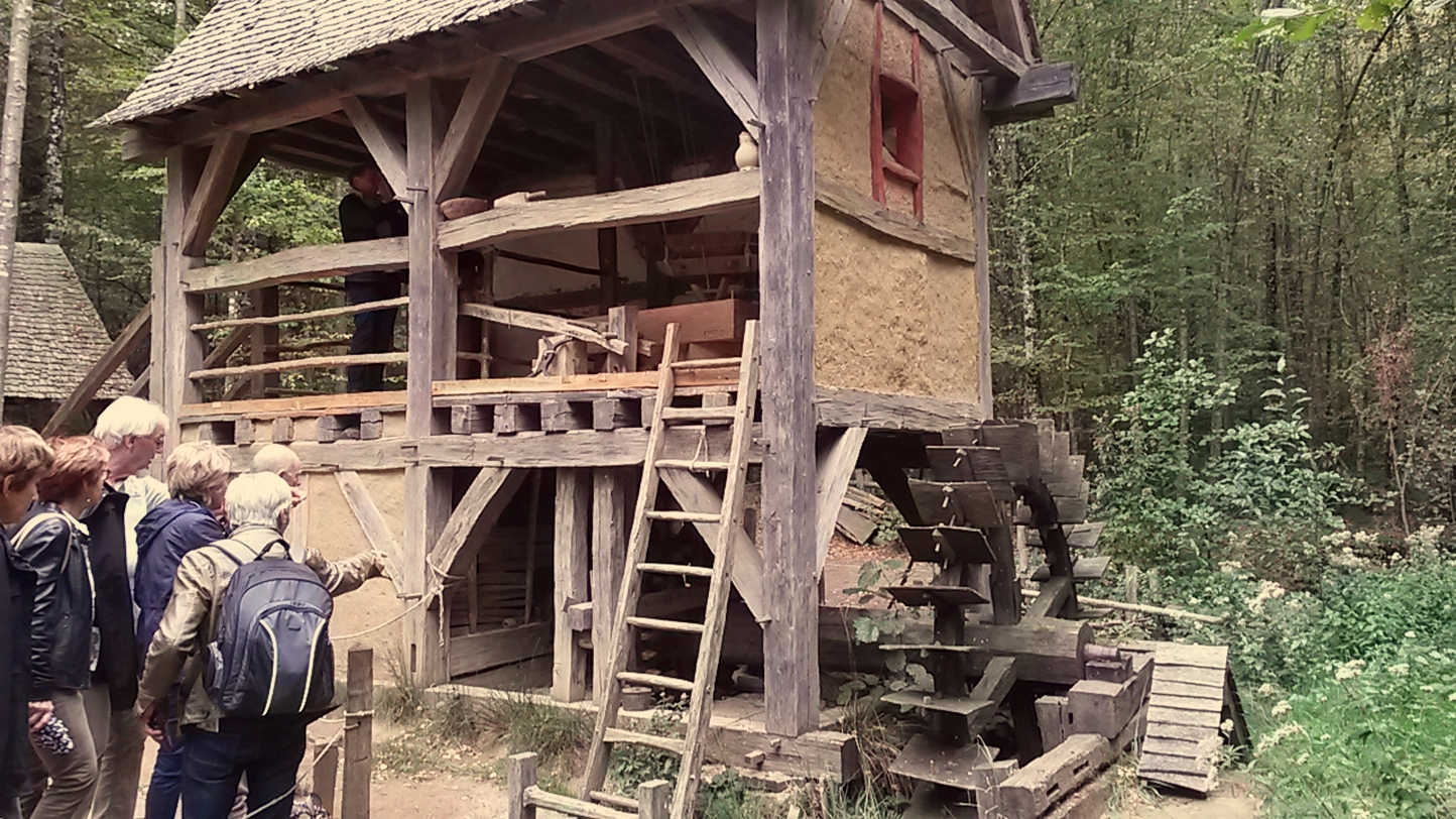 Il y a 50 % de femmes parmi les employées, dont la directrice (Au Moyen-Âge, des femmes étaient employées en charpente, aux enluminures…etc). Notre guide est guide conférencière, et teinturière sur le chantier. Il y a un maître d’œuvre (il était volontaire en 1998, puis il est resté), il a fait les plans, il coordonne les réunions de chantier dans la cour : on travaille comme au Moyen-Âge… mais avec les exigences du XXI ème siècle : sécurité, législation du travail etc.