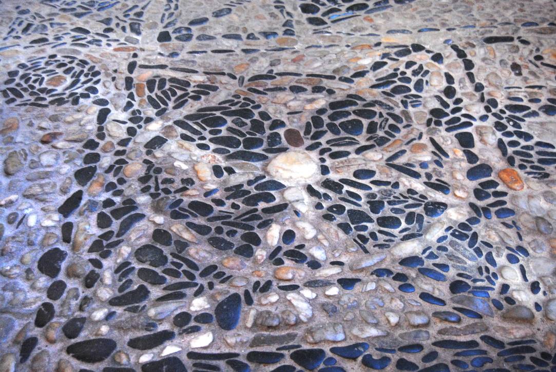 Avec ses 5 travées, ses bas-côtés de la nef, ses 74 m de long, et ses 22 mètres de haut St Julien est la plus grande des églises romanes d’Auvergne. Notre guide nous fait remarquer le mélange des styles avec la voûte centrale surhaussée de type gothique, ainsi que les fresques du 12ème siècles mises à jour en 1956. Le sol découvert grâce aux travaux d’installation du chauffage est entièrement réalisé en galets multicolores de l’Allier disposés suivant une grande variété de motifs géométriques, y compris pour la partie plus ancienne située devant le choeur dont les galets sont de taille plus réduite.