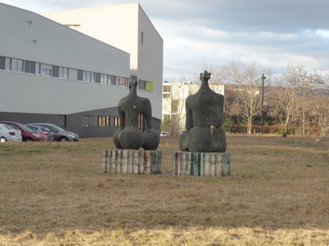 Nous passons par la place Vasarelli aménagée en lieu de détente pour les étudiants, (fauteuil, pelouses…), devant la bibliothèque universitaire et les bâtiments des mathématiques abritant le centre de calcul.